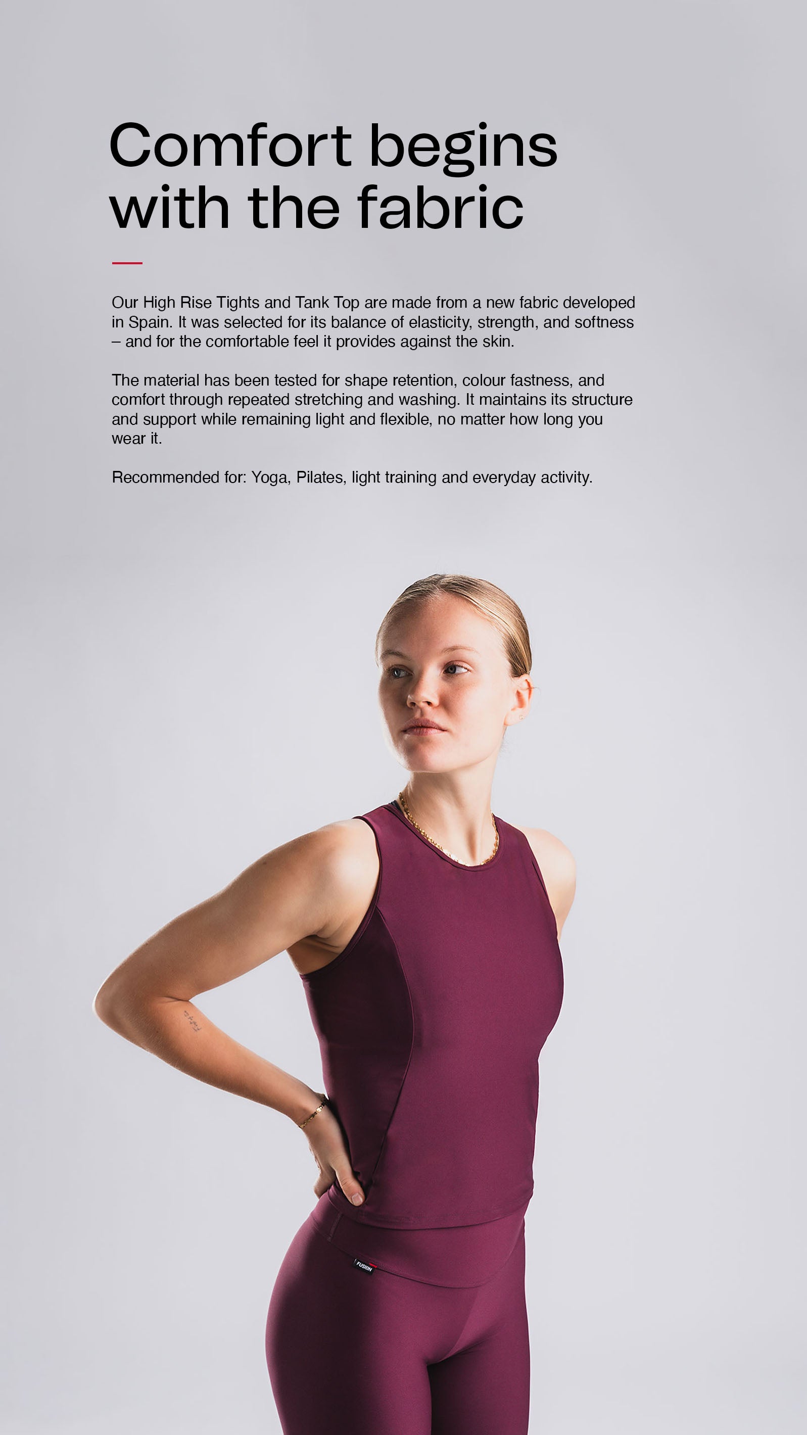The fabric is produced in Spain and chosen for its balance of elasticity, strength, and softness. It feels natural against the skin and maintains its shape even after repeated wear and washing. The dense knit provides full coverage, making the material completely squat-proof while remaining light and breathable.